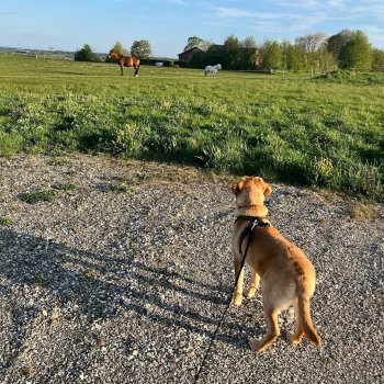 Bahloo er på vovseventyr og lidt bange for nysgerrige heste og køer! 🤪🐾❤️